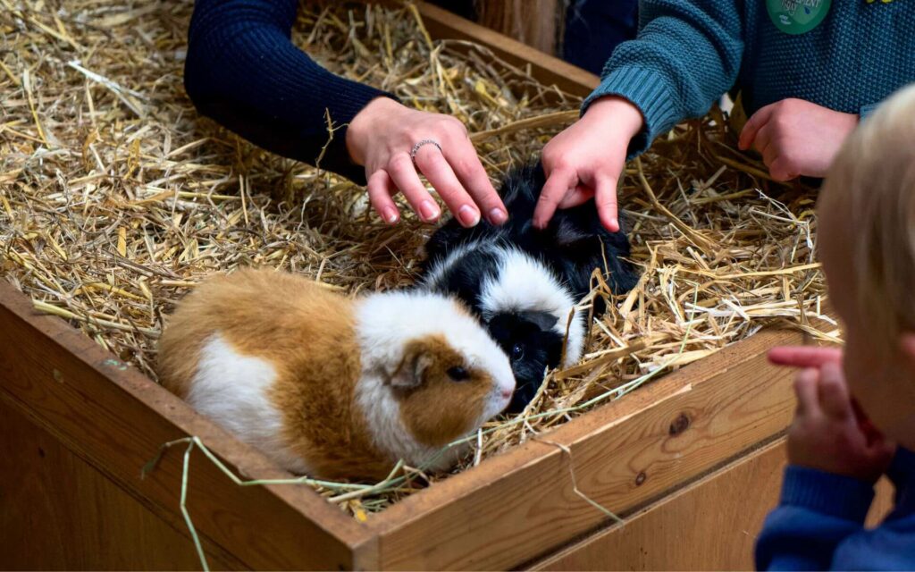 Photo of two guinea pigs on a bed of straw being petted by small children